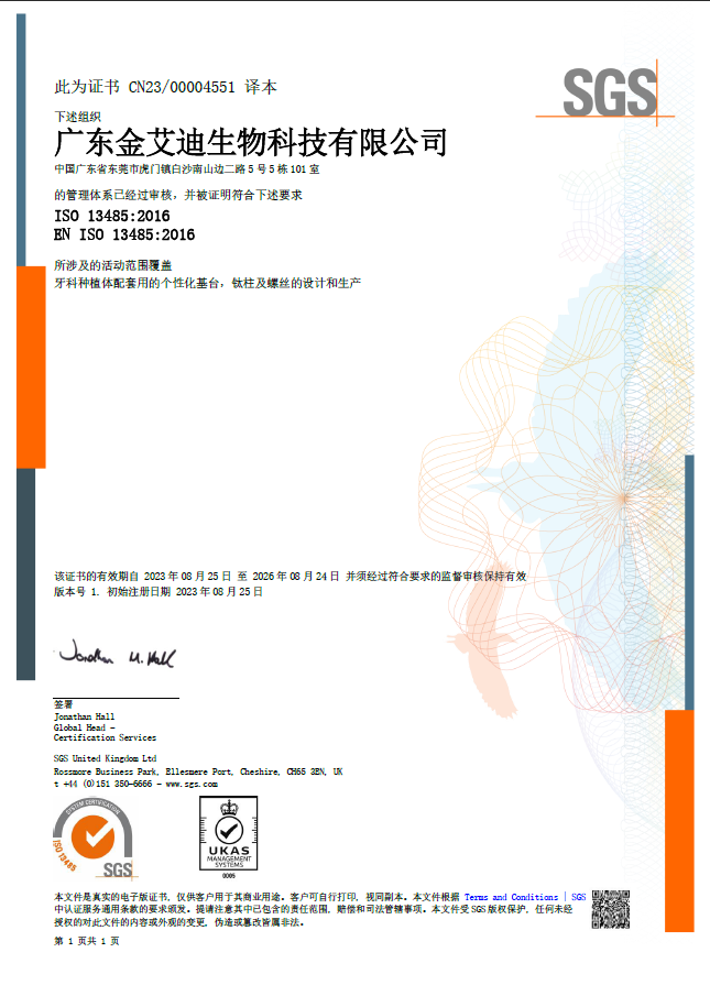 广东金艾迪生物科技有限公司隶属于定远国际集团旗下分公司。公司源于全球先进的植体制造商和权威的医疗单位共同发起,并成立于2019年5月。